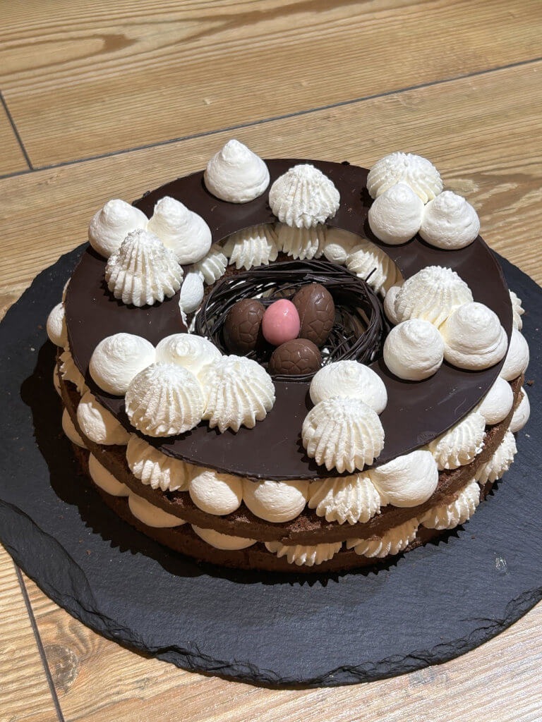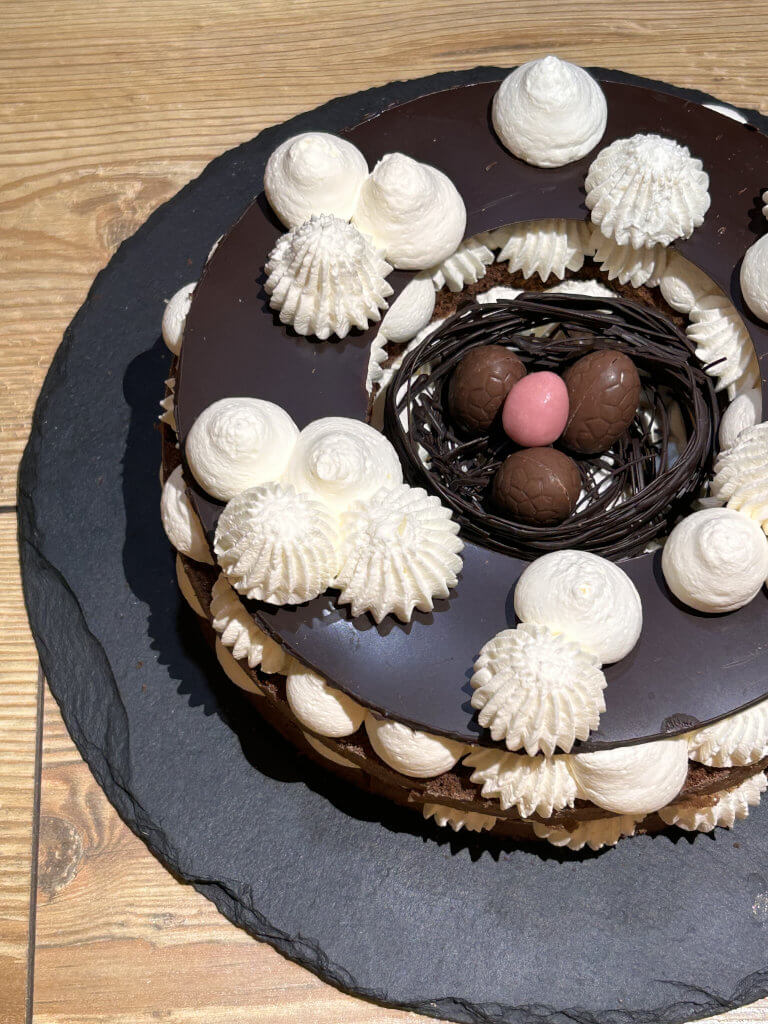 Vous retrouverez au centre du gâteau, le cœur du printemps avec un évidement délicat qui abrite un nid réalisé en chocolat noir, protégeant quelques œufs gourmands : un trésor à partager. Mais pour plus de gourmandise s’y cache un insert fondant de caramel beurre salé, fait maison, apportant une note de sel subtile et un fondant irrésistible en bouche.